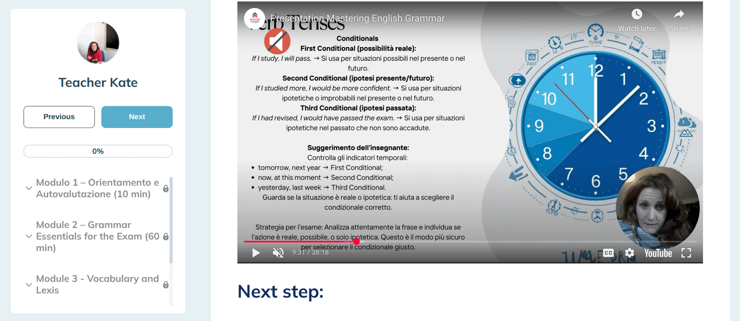 Attraverso video lezioni con slide, moduli mirati di grammatica e vocabolario, attività di lettura realistiche e simulazioni pratiche dopo ogni modulo, potenzierai le competenze chiave richieste nell'esame ufficiale.